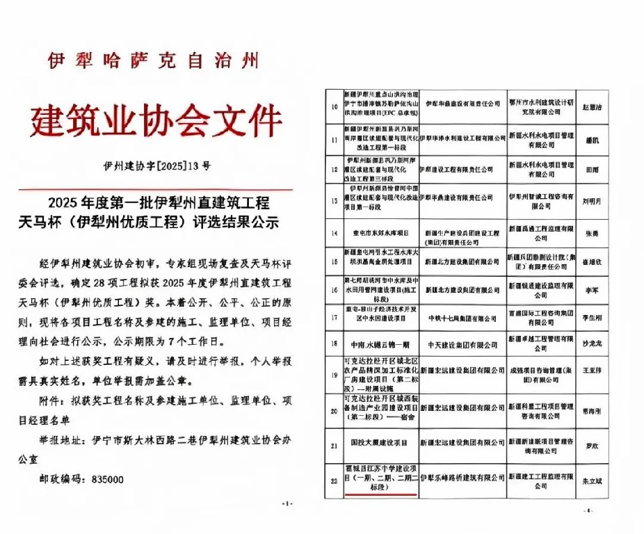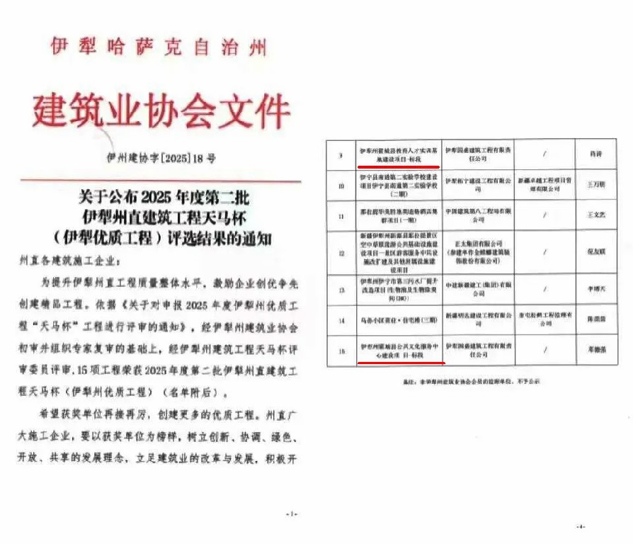 近日,伊犁哈薩克自治州建筑業協會發布《2025年度第一批伊犁州直建筑工程天馬杯(伊犁州優質工程)評選結果公示》(伊州建協字〔2025〕13號文),《關于公布2025年度第二批伊犁州直建筑工程天馬杯(伊犁州優質工程)評選結果的通知》(伊州建協字〔2025〕18號文),霍城縣江蘇中學建設項目、伊犁州霍城縣教育人才實訓基地建設項目、伊犁州霍城縣公共文化服務中心建設項目榮獲2025年度伊犁州直建筑工程天馬杯(伊犁州優質工程)獎。